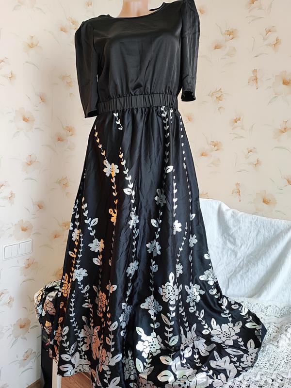 Розкішне брендове атласне довге плаття чорного кольору. Розкльошена довга спідниця в сріблястий квітковий принт. Тканина легка, чудово сідає на фігурі. Має приголомшливий, дуже ефектний та стильний вигляд. ПОГ-ПОТ-НОТ 46-36 (на гумці, тягнеться до 50) — 65 см. У плечах 38 см. Довжина рукава від плеча 32 см. Довжина по спинці 140 см. Стан нової речі. Сліди носіння немає. Дефектів немає.