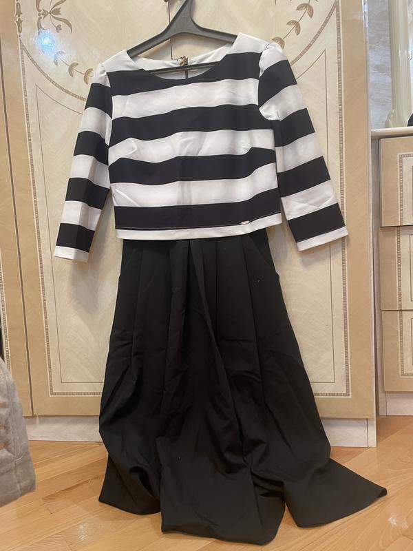 Складається з топа та юбки з кишенями, французька довжина .