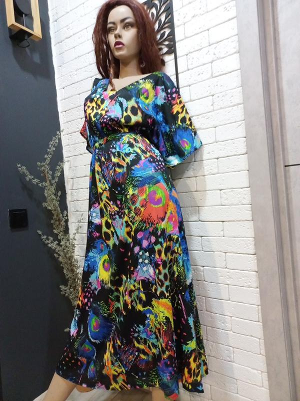 дуже гарна,ярка,стильна,фірменна довга сукня з поясочком ,стан ідеальний як нова річ,розмір 58-60-62,має підклад ,гарні рукавчики ,які гарно ,ніжно ,вільно лежать на плечиках і придають ще більш жіночності,дуже гарні яскраві кольори насиченні ,з заді завязується на поясок,100%полієстер,тканина приємна на дотик і до тіла довжина перед 125,з заді 131 в груді 67 напівобхват під грудьми там де поясок 50 +резинка з заді тянеться до 60см ,напівобхват , талія 68 в стегнах 88 низ 110 вихід рукава 28 напівобхват всі заміри напівобхват
