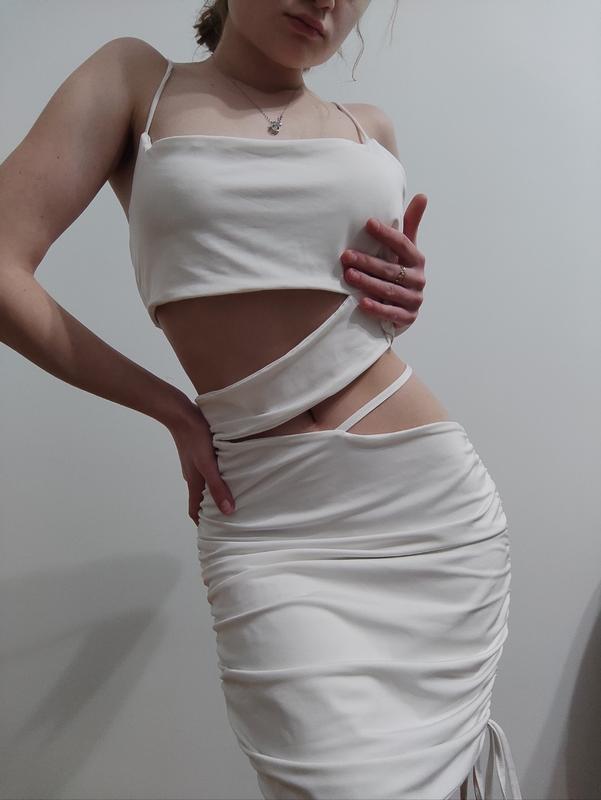 🤍 шикарне плаття плаття з відкритим животом та спиною стан ідеальний шикарно сидить на тілі 🤩 тканина дуже приємна, та добре тягнеться з одної сторони плаття стягується розмір M L Заміри: Підходи грудей 40 сантиметрів Пів обхват Бендер 45 сантиметрів Плаття дуже гарно тягнеться ще на + 10 сантиметрів усюди за замірами та додатковими фото, звертайтеся якщо робите покупку то на 2 річ -10% знижки