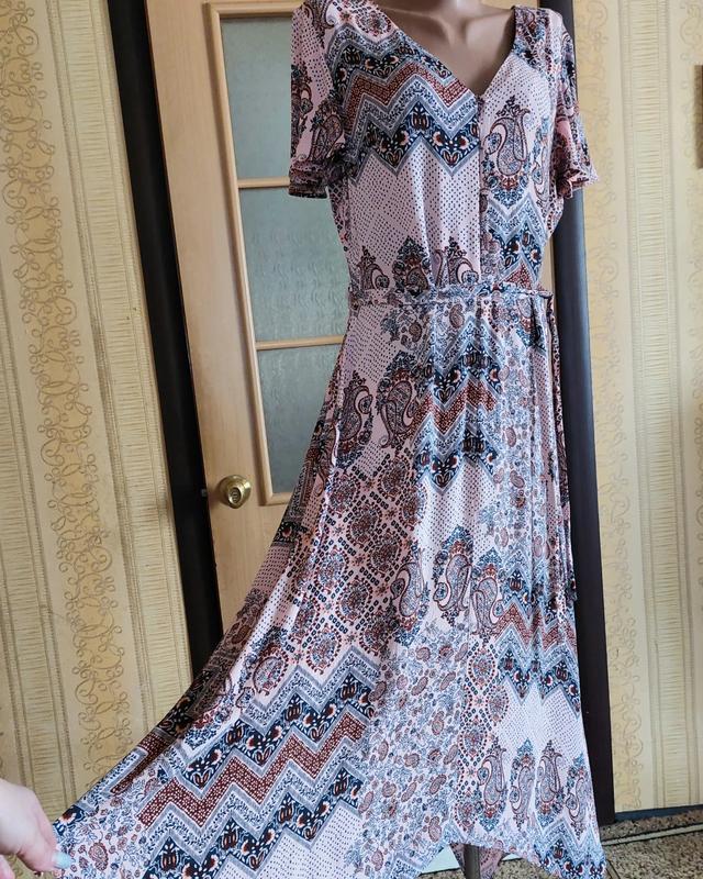 Класна, розкішна, приваблива довга сукня. Неймовірно гарний принт, чудовий вільний, повітряний крій. Спереду до талії на гудзиках, з'ємний пасок,на якому є застібка від бірки, стан нової. Довжина до довгого вирізу бокового шву 130см, спереду довжина 115см, пог 52см, плечи 40см, пот 44см.