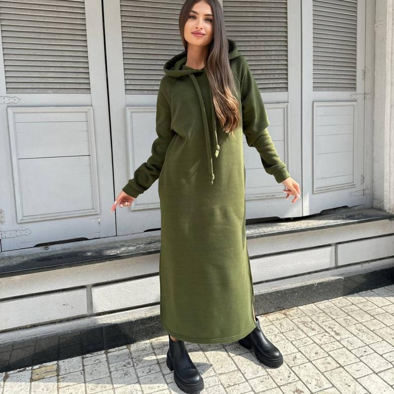 Сукня худі з капюшоном довга на флісі хакі чорна рожева