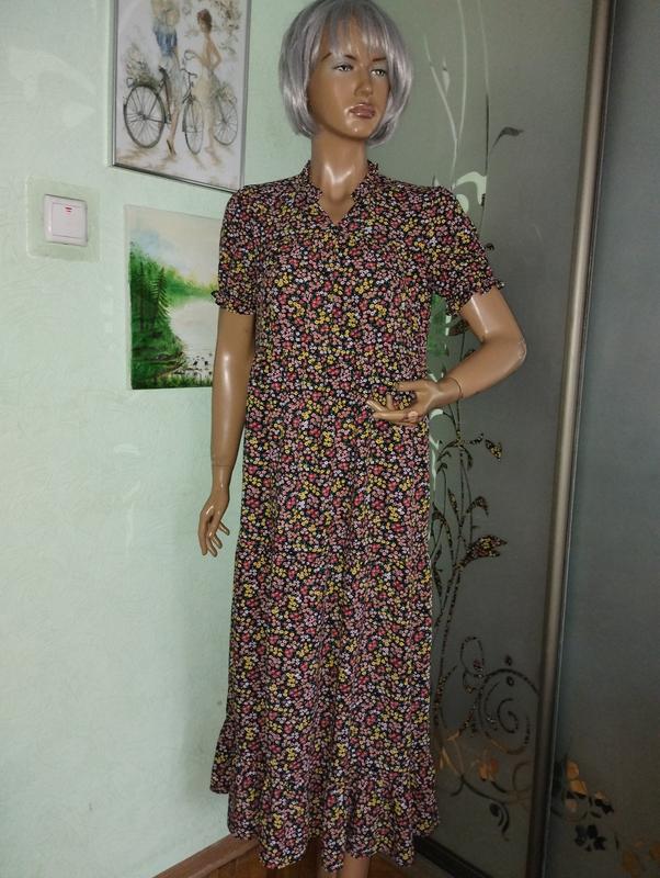 Сукня з гарної щільності крепованої віскози.Пог46-48,пот 48,поб 65,довж рук 23,рукавчик на резиночках,плечі вверху 40,довж 129,по бірці с ка,може підійти і на м ку.Сукня складається з 4 ьох ярусів,перший починається в районі грудей,крій вільний,може підійти і вагітним.