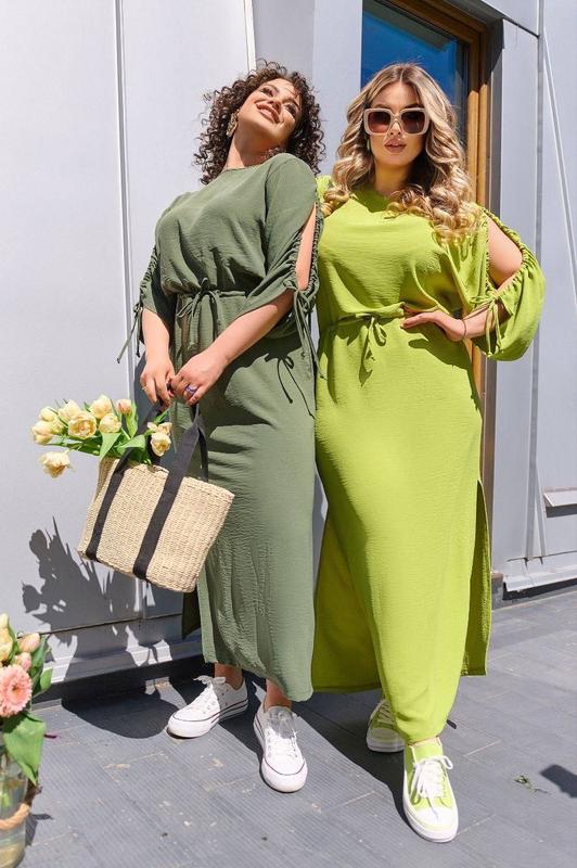 Сукня " з завязками " # 901 (ал-коз) Ціна 1100грн Розміри: 48-50, 52-54, 56-58. Розміри йдуть спарені. Тканина: Літня жатка, гарної якості. Фактичні виміри: За 48-50 розміром. Довжина від плеча - 145 см. Рукава від горловини- 65 см. ОГ- 120 ++ см. ОТ - 102 см. ОБ - 114 см. По низу- 112 см. До кожного наступного розміру додавати + 4см (на поодинокі розміри). На спарені +8см,крім довжини виробу. Додаткові характеристики: Сезон: кінець весни, літо, початок осені. Вільного покрою, стильна та якісна сукня, в стилі Спорт- шик, на рукавах є куліски які фіксують довжину рукава. По талії теж йде куліска для фіксаціі. Розрізи по боках. Сукня підійде для будь якого випадку. Гарно компонується під любий стиль взуттья. Кольори виробу: Цегляно- рудий. Джинсовий. Пудровий. Оливковий. Хакі.