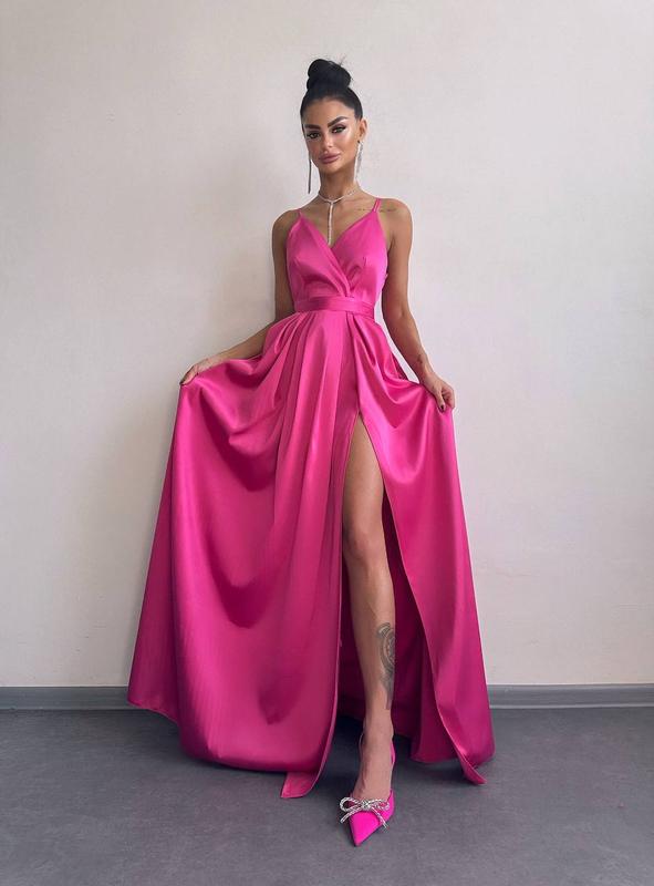 Вишукана атласна сукня максі на брителях, довге атласне плаття з розрізом