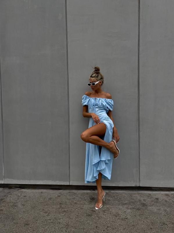 ▪️тканина : жатка ▪️колір: молоко, блакитний ▪️розміри :SM /ML Сукня з розрізом ; Виріз та обʼєм декольте регулюється шнуровкою 👌 Розміри SM | ML Груди: 83-89 см | 90-97 см Талія: 60-66см | 69-75см Стегна : 88-94 см | 95-102 см