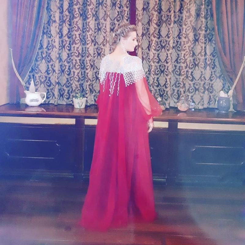 Платье выполнено из еврофатина бордового цвета, декорировано кружевом ручной работы. Подойдет с 44 размера по 48 за счет свободной формы. возможен пошив из любого цвета .тел. 0660449235