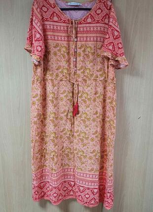 Длинное вискозное платье большого размера, талия на кулиске, спереди до талии пуговицы.Цвет абрикосовый, красный.Новое, без бумажной этикетки.Люкс сток.Ог 115, талия 106-, Об 138, рукав 25, длина 122.