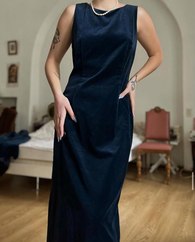 Досить стримана, але елегантна сукня. Колір ближче до чорного, але з темно-синім відтінком. Особливість цієї речі - це спинка, оскільки сукня застібається на безліч ґудзиків. Є нюанс, не вистачає одного ґудзика (третій зверху). Місцями непомітні потертості. Через це ціна буде нижчою. Розмір М Загальна довжина - 135 см Напівобхват груди - 48 см Напівобхват талія - 42,5 см Напівобхват стегна - 49 см Тканина - бавовна
