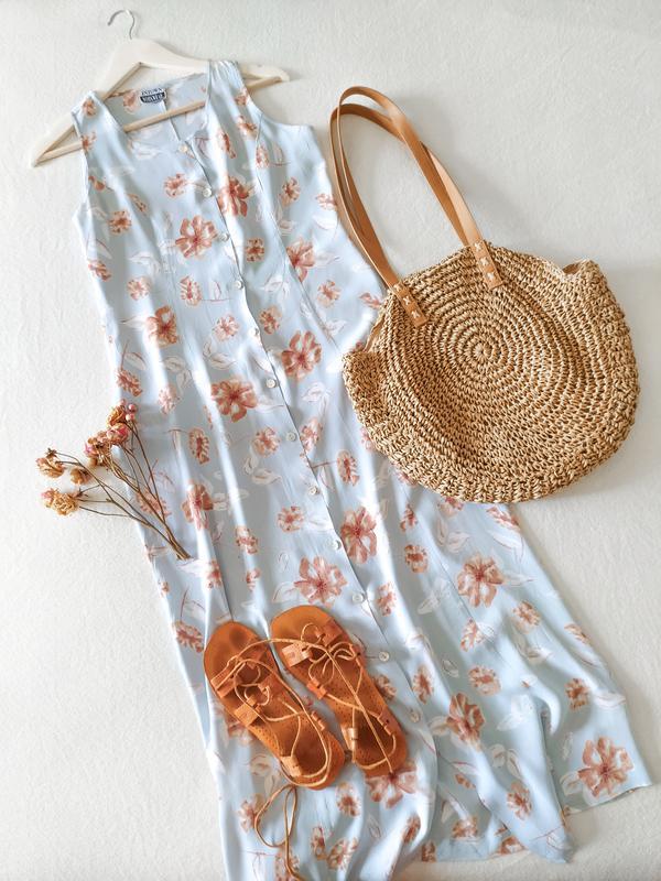 Довге плаття з віскози у квітковий принт. Застібка по всій довжині на перламутрові ґудзики. Склад: 100% віскоза. Розмір XS/S, невелика М. Стан ідеальний.