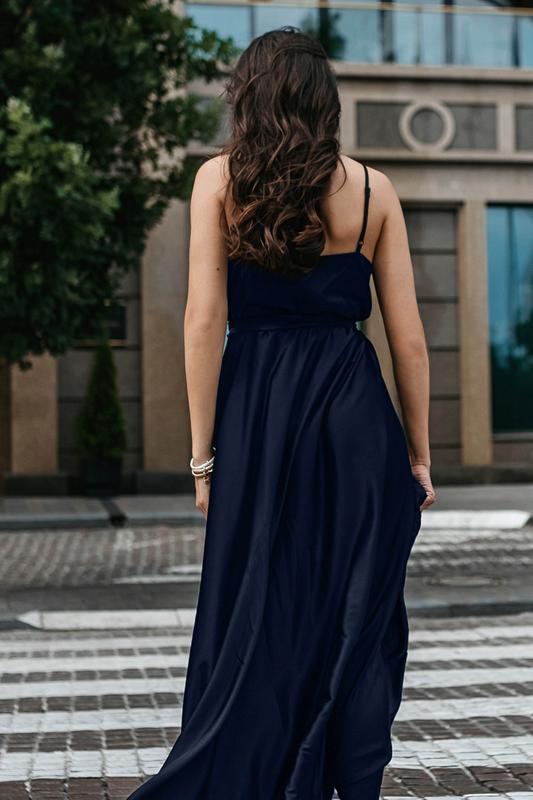 Плаття жіноче довге на запах на тонких бретелях, ошатне, шовкове, однотонне, темно-синє