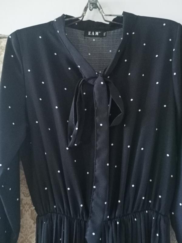 сукня чорна у білий горох, воротник зав'язується на бант, рукава та талія на резинкі, хлопок -полієстер, юбка легке пліссе