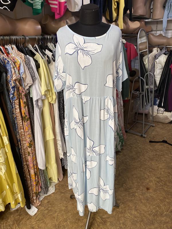 Сукня, віскоза, розмір універсальний, заміри ПОГ 60см, ПОТ 62см, ПОБ 75см, довжина 125см. Рукав 25см. По бокам кармани.