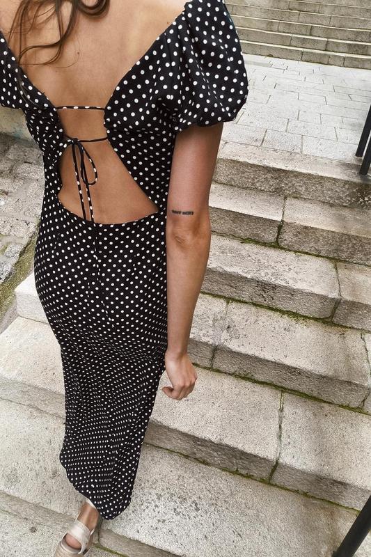 Ціна 1880 Сукня з суміші льону. V-подібний виріз зі зборкою та короткими рукавами-буфами з еластичною обробкою. Відкривається деталь ззаду з тонкими лямками та зав'язкою. Розріз спереду на подолі. Невидима застібка-блискавка. Чорний / Білий | 0387/151