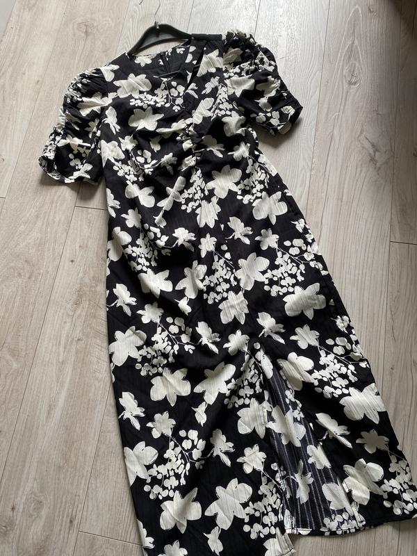 Гарна сукня по фігурі котон довга чорно-білий принт 12 л На підкладці Призбираний рукав і спереду Розріз 34 см Довжина 110 Плечі 32 Напівобхват грудей 41 плюс трохи Талії 38 сзаду блискавка Стегон 46 Котон 95, 5 еластан