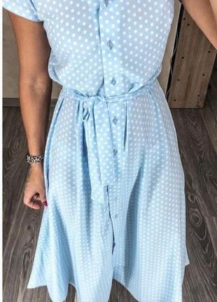 Сукня в горох на ґудзиках. Пояс в комплекті. Размер S (42-44). Цвет нежно голубой. Ширина груди 44 см, талия 40 см, длина 118 см. Ткань софт.