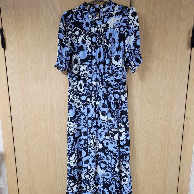 Длинное вискозное платье, воротник стойка, талия на широкой резинке, рукав фонарик внизу на широкой резинке, застёгивается сзади на две пуговки, черный, серо-голубой, молочный. Новое, без бумажной этикетки, люкс сток. Ог 116, талия 74+, Об 130,рукав 29, длина 121.