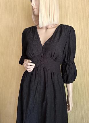Черное, длинное платье из жатой ткани. Очень мягкое и приятное к телу. Идёт на подкладке из хлопка. Сзади пояс на широкой резинке. Спереди разрез. Состояние идеальное. Бирка с размером срезана. Подойдет на L-XL. Длина 135 Плечи 41 По груди 50+ небольшие вытачки По талии 44 Рукав 42 По бедер свободно (80+/-)