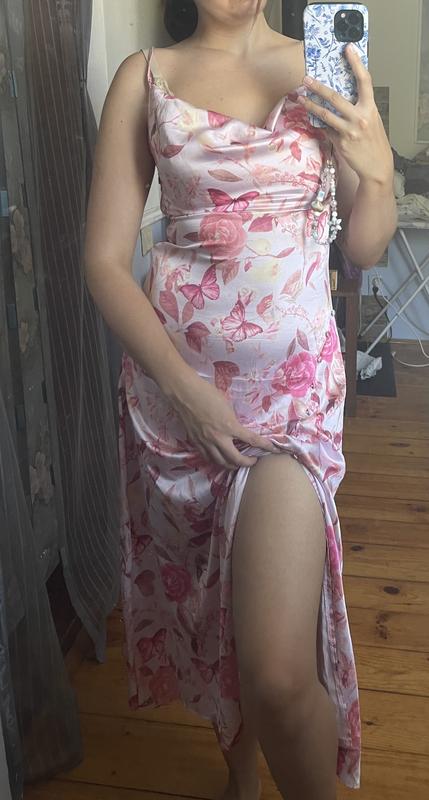 Сукня сатинова у квітковий принт з вирізом на нозі