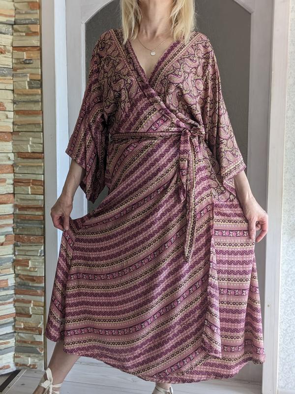 Невероятно красивое платье на запах из шелка. Ощущение - оно отсутствует, настолько легкое и приятное к телу💯🤩😍. Состав ткани -100 шелк натуральные💔💔💔 Замеры: Плечі-46 Длина рукава -42 Пог-56( регулировка) Далее -оверсайз. Длина изделия -135 Эта вещь- настоящее сокровище для лета 💓💓💓