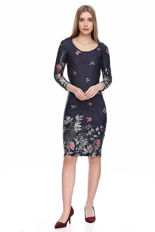 Тепла синя сукня з м'якої ніжної ангори. Рукав завдовжки три чверті, круглий виріз горловини. Низ сукні прикрашений купонним малюнком. Довжина близько 90 см 40% вовна, 32% віскоза, 23% поліестер, 5% еластан