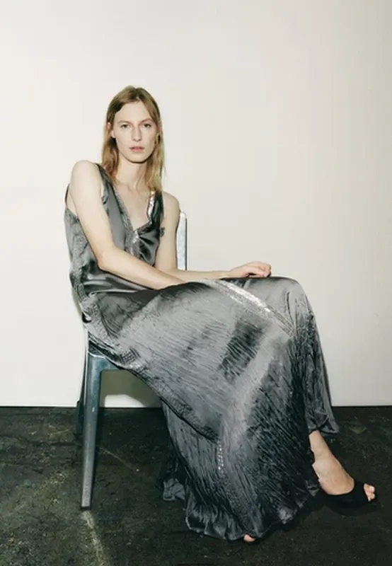 Нова з ,бірками,pS,.підійде на S-M Zara limited edition Атласна сукня міді із жатої тканини зі 100% віскози, з V-подібним вирізом та рукавами з проймою, прикрашена деталями вишивки з аплікацією бісером.