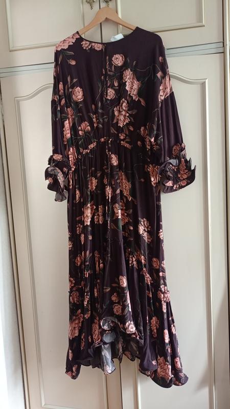 Платье просто роскошное, в безупречном состоянии. Роянная юбка с рюшами, которые подкреплены лезвием, держат красиво форму. На рукавах тоже. Верх как-то интересно покроено полукругом, веревочки фиксируют, чтобы красиво седало по фигуре. Передняя часть слегка короче, чтобы было видно обувь, сзади ровное. Рукава!! Роскошь просто. Очень красивая цветовая гамма, такое изысканное платье. Вискоза. Размер - XL. Плечи спущенные, подмышками - 74, талия в спокойном состоянии - 51, но там резинка и шнур, тянется до 64, бедра - 75, длина впереди - 127, сзади - 140.