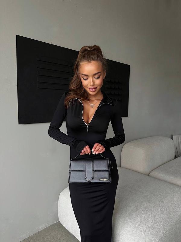 Сукня виготовлена з мікродайвінгу - еластичної та гладкої тканини, яка підкреслює фігуру та забезпечує комфорт. Доступна у розмірах 42-44 та 44-46, що дає можливість підібрати ідеальну посадку. Колір - класичний чорний, що додає сукні елегантності та універсальності для будь-яких подій.
