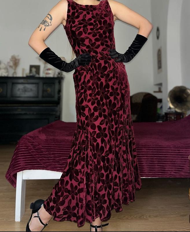 Вінтажна елегантна сукня у бордовому кольорі з оксамитовими вставками у вигляді квітів, бренд County casuals❤️🔥 Має сидіти трошки вільно, не в обтяжку. Низ сукні йде більш вільним. Тканина досить мʼяка і приємна на дотик, склад - 70% віскоза, 30% шовк. Підкладка - 100% поліестр. Розмір М або щоб сиділа більш вільно то S Довжина - 137 см На груди до 90 см На талію до 75 см Стегна до 100 см Стан чудовий, дефектів не знайшла