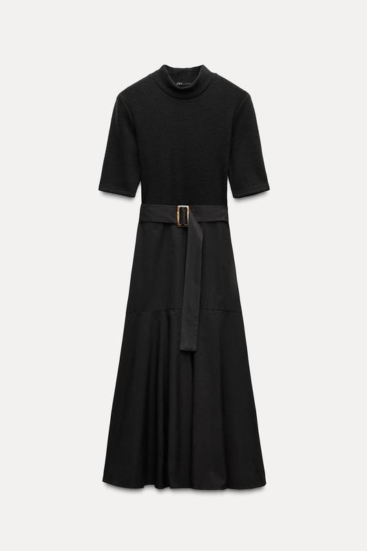 Ціна 1375 Сукня міді з коміром Perkins і короткими рукавами. Регульований ремінь з пряжкою. Деталь поєднання тканин в тон. Низька розкльошена лінія. Чорний | 0264/737