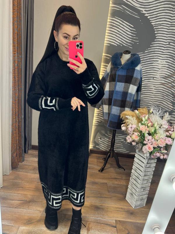 колір синій,чорний тепла, комфортна і неймовірно красива сукня зігріє вас в холодну пору року, в ній вам будуть нестрашні будь-які морози, вона доповнить ваш гардероб якісною річчю сукня вільного крою з круглим неглибоким вирізом на грудях виконана зі зносостійкої та затишної альпаки, вона має чудовий вигляд на дівчатах з різними типами фігур, приховає можливі недоліки та підкреслить достоїнства розмір оверсайз 52-58 довжина 118 см, об'єм грудей по виробу 120 см тягнеться до 134 см. довжина рукава від шиї 77-78 см код 0632