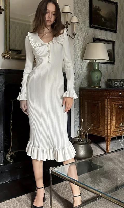 Ціна 2150 Елегантна Віскозна В'язана Сукня Однокольоровий, класичний Комір, Деталі Кнопок,