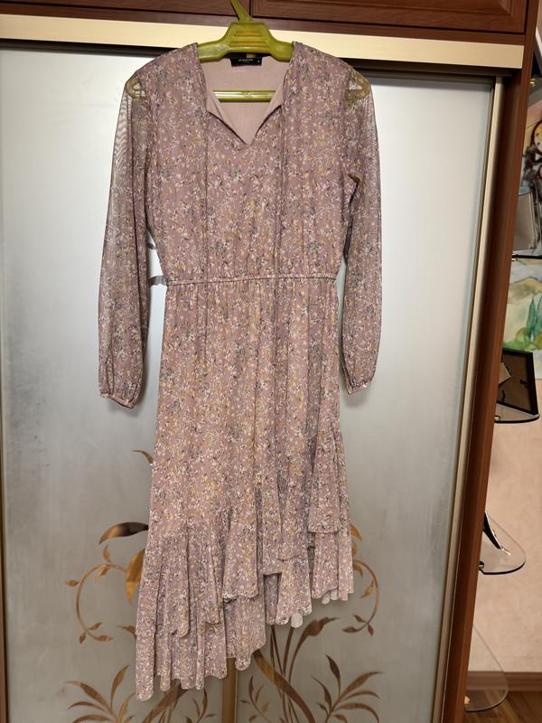 Рожеве плаття в квітковий принт Розмір М Плече 12 см рукав 57 см Талія 34 см гумка у спокійному стані Тягнеться 47 см Довжина правої сторони 122 см Ліва 100 см Від плеча до плеча 38 см Стегна 43 см Склад Віскоза/Поліестер Стан ідеальна