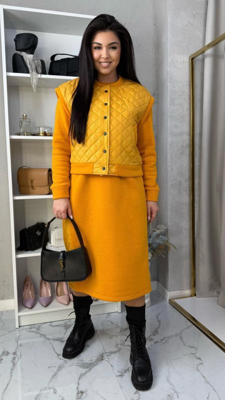 Стильна жилетка ідеальної довжини з кишенями та манжетом по низу. Сукня з вставками зі стьобаної плащівки по боках. Зручна та комфортна модель, яка виглядає надзвичайно стильно. 🔶Кольори:Гірчиця, Чорний,червоний. ✅Тканина:Стьобана плащівка"Лаке" на 80 силіконі на підкладці. Сукня 3х нитка 📌Розміри: 52-54;56-58;60-62;64-66 52-54 Жилетка Об'єм грудей 132 см Об'єм по низу 125см Довжина виробу 58 см Ширина плеча 21 см Сукня Об'єм грудей 123 см Об'єм талії 121 см Об'єм стегон 127 см Довжина рукава від плеча 63.5 см Довжина виробу 116 см 56-58 Жилетка Об'єм грудей 142 см Об'єм по низу 135 см Довжина виробу 59 см Ширина плеча 21.5 см Сукня Об'єм грудей 133 см Об'єм талії 131 см Об'єм стегон 137 см Довжина рукава від плеча 64.5 см Довжина виробу 117 см 60-62 Жилетка Об'єм грудей 152 см Об'єм по низу 142 см Довжина виробу 60 см Ширина плеча 22 см Сукня Об'єм грудей 143 см Об'єм талії 141 см Об'єм стегон 147 см Довжина рукава від плеча 65.5 см Довжина виробу 118 см 64-66 Жилетка Об'єм грудей 162 см Об'єм по низу 155 см Довжина виробу 61 см Ширина плеча 22.5 см Сукня Об'єм грудей 153 см Об'єм талії 151 см Об'єм стегон 157 см Довжина рукава від плеча 66.5 Довжина виробу 119 см окс