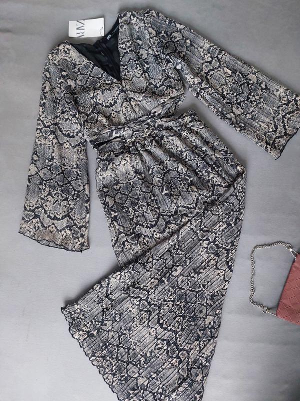 Ефектна сукня в зміїний принт бренду Zara з V-подібним вирізом та довгими рукавами,вирізи по боках на талії,контрасна чорна підкладка,застібається на приховану блискавку . .Заміри:ПОГ 37+,ПОТ 33см,ПОБ вільний,довжина рукава 58см,довжина 131см.