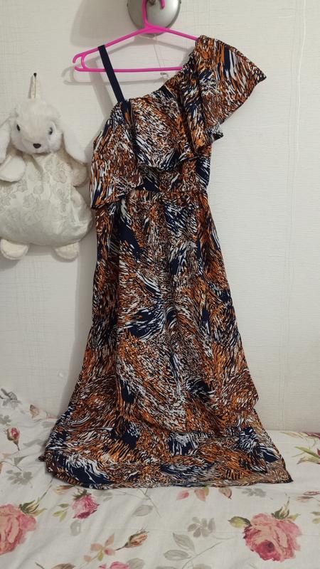 Платье очень интересное и эффектное. Стан безупречен, с одной стороны разрез. Очень удобная и легкая. Размер - 8. Состав ткани - полиэстер. Подмышками - 46, талия на резинке - 35, тянется до 46, длина - 141.