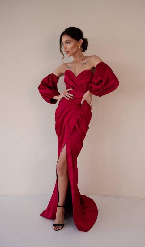 Розкішна сукня зі шлейфом та розрізом від стегна🥰 У цій сукні чудово все. Об'ємні рукави, які можна зняти. Коли в одній сукні з'єдналися розкішна тканина, корсетний верх у вигляді серця, шлейф та розріз від стегна – виходить справжній шедевр. Розмір: XS (під замовлення) Розмір: S, M Розмір: L, XL (під замовлення +200грн) Матеріал: королівський атлас Ціна 1999 грн Арт.ber