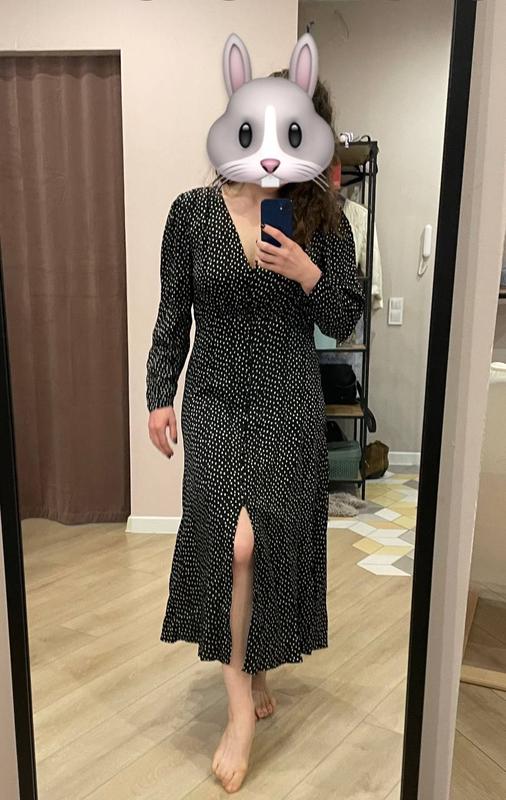 Чорна сукня з білим дрібним принтом. Трикутний виріз, довгий ряд красивих гудзиків (розстібати їх не потрібно). Натуральний матеріал, дуже приємний до тіла. Підійде для роботи, для побачення, на будь-який випадок :) З туфлями, босоніжками, чоботами. Вдягала пару разів.