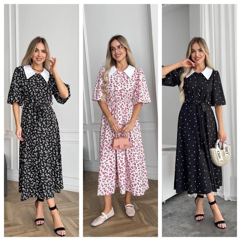 5635 Жіноча сукня Розмірний ряд S,M,L,XL Тканина софт Кольори біло-рожевий , чорний квітка та чорний горох У комплекті пасочок, застібаєтсься сукня на ґудзики Дуже стильна та романтична сукня Можно вдягати під будь-яке взуття