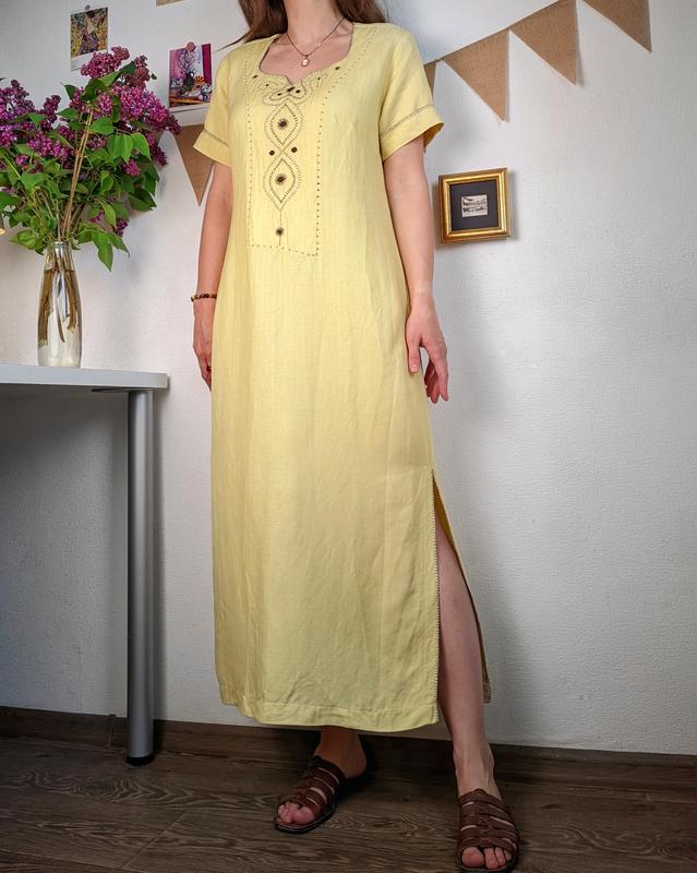 Сукня вишиванка туніка довга максі жовта лимонна вишивка етно-бохо бавовна льон l xl