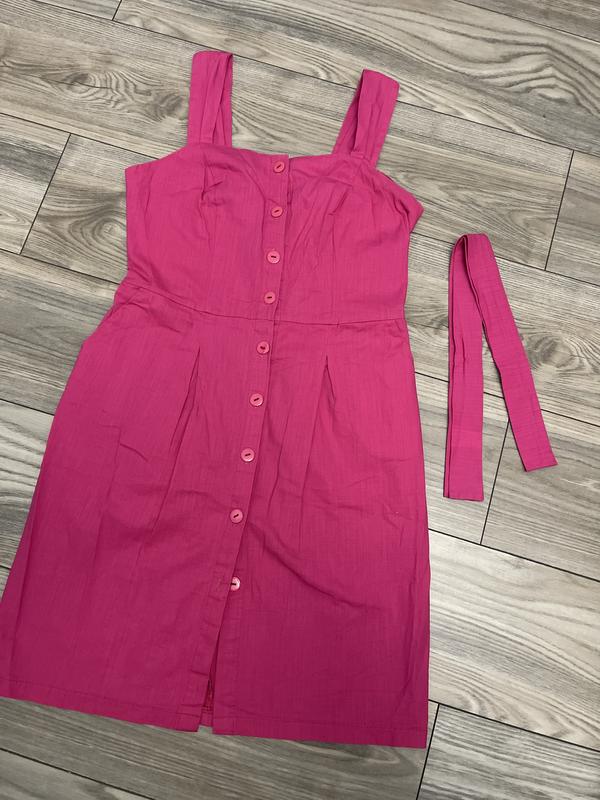 Продам коротку сукню приємного кольору фуксія(рожевого) на робочих ґудзиках і паском,що підкреслює талію.Тканина -сучасний льон,дихає,трохи тягнеться,не так сильно мнеться.По боках кишені Стан ідеальний,без дефектів
