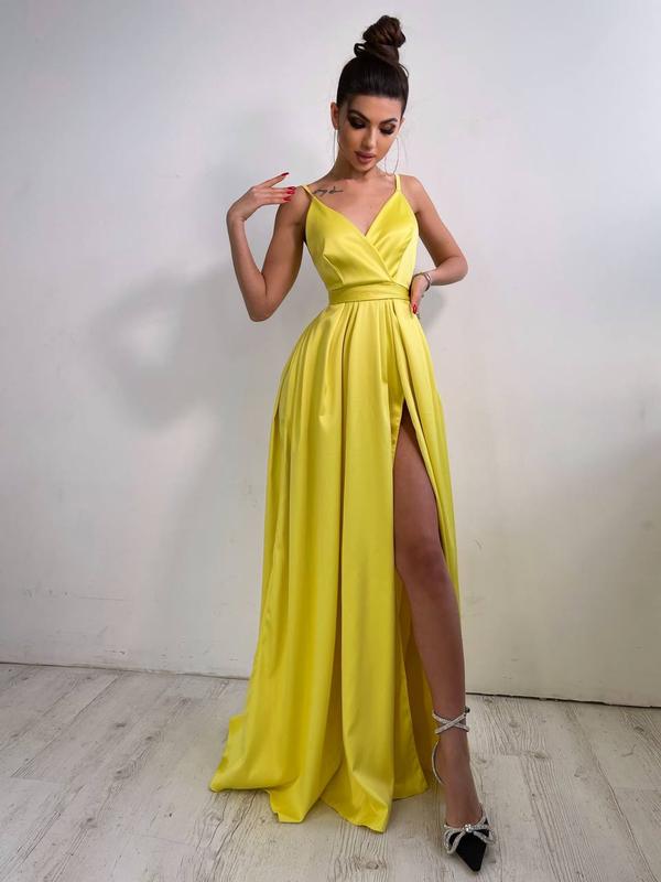 Жіноча довга жовта атласна сукня максі із декольте і розрізом на нозі ніжна лимонна