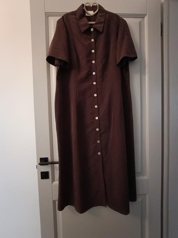 Плаття -сорочка, виробництва Великої Британії, розмір 20. Довге, застібається на гудзики, ззаду невелика шліца. Колір фото не передає, шоколадно-фіолетового відтінку, дуже цікавий. Тканина схожа на спандекс, але 70% віскоза (модал), 30% поліестер. Додаткові заміри: ширина плечей 42 см, напівобзват пахв 60 см, напівобзват талії 56 см, напівобзват стегон 67, довжина рукава 28 см, довжина 125 см. Сток. Стан нового. Пересилка за рахунок покупця. Повернення не передбачено, робіть свій вибір свідомо. Приємних покупок!