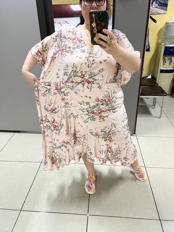 Шикарное невесомое платье Нежнейшая расцветка Длина перед 109 Длина зад 131 Грудь полуобьем от 67 можно больше Бедра полуобьем от 85 и дальше за счет запаха есть пояс можно носить без пояса Есть карманы Ткань полиэстер но к телу приятное и невесомое