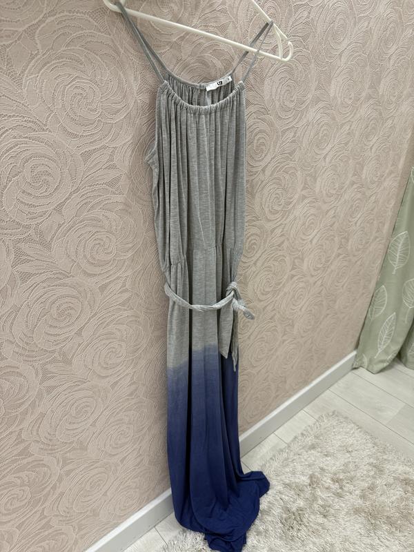 Незвичайна сукня-максі ,дуже прикольного кольору,сірий переходить в синій (градієнт) від турецького бренду LTB Дуже якісна тканина ,без нюансів. Мʼякий та тонкий ,але не світить і буде комфортно у спеку Є пасок Вдягався пару разів по бірці розмір С,але буде гарно в на М Заміри: Довжина від верха спинки 130 см ❗️ Груди півобсяг 49 см Талія на резинці,у спокої 35,тягнеться до 40 Стегна півобсяг 50-51,але краще щоб було на пару см менше ніж сукня,тобто до 98 десь щоб стегна були,менше можна щоб гарно сиділо не обтягувало
