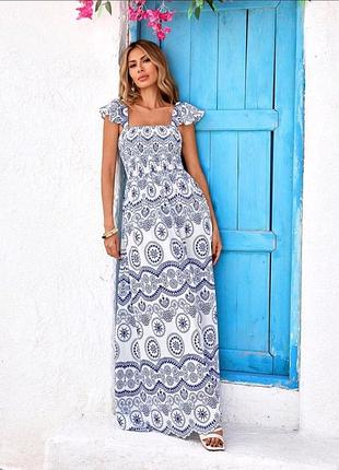 Нова, останній екземпляр! Розкішна довга сукня, з оригінальним розрізом на спині. Ідеальна посадка по фігурі, ліф повністю на резинці, дуже гарний принт. Низ фігурно вирізаний, не прострочений. Якість відмінна Розмір вказано L, але йде на М-L Ширина по грудях 38 см (тягнеться) Ширина по талії 35 см (тягнеться) Ширина по бедрам 68 см Довжина від плечей: 143 см 100% Поліестер