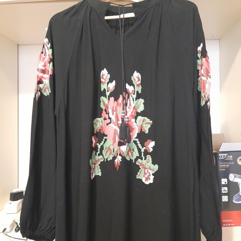 Тканина штапель. Внизу з боків розпорки. Вишивка ( накат) на рукавах та з переду. Рукав довгий зібраний на резинку. Не вдягалось, паперова бірка відсутня. Розмір L. Заміри надам