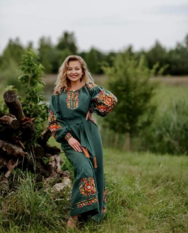 В наявності та під замовлення (уточнюйте). Термін виготовлення від 10 днів. Довга лляна сукня зеленого кольору з яскравою квітковою вишивкою. Оригінальний орнамент в стилі петриківського розпису прикрашає пишні рукави, перед плаття та поділ спідниці. В комплекті є пояс з червоно-помаранчевими китицями. Довга зелена сукня з квітковою вишивкою помаранчево-червоного кольору з салатовими, жовтими та сірими елементами. Оригінальний квітковий орнамент в стилі петриківського розпису покриває майже повністю верх вишиванки: рукава, манжети, плечі, груди. Спинка однотонна. Застібається вишиванка спереду. Пишні рукави починаються від плеча, а не від горловини, що дозволяє візуально зберегти тендітність жіночої статури. Поділ спідниці має вшиті з боків клини, які розширюють плаття трикутником донизу. На них також красується вишивка. Зверніть увагу, колір тканини і вишивки може дещо відрізнятися від зображення на екрані через неточність передачі кольору монітором. мод.луц4505