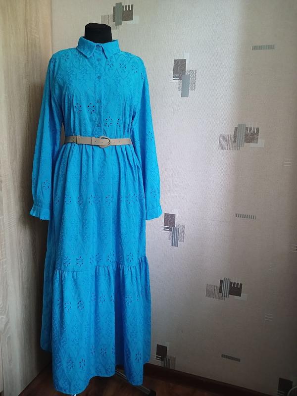 Бомбическое ярусное платье рубашка my Bukle. Состояние новой. Насыщенный голубой цвет. Есть подкладка юбка. Ткань достаточно плотная, держит форму. Выглядит очень нарядно. Фото не передает, прошва выглядит фактурно. Ремень мой, одела для примера. Подходит на М больше, чем на меня. Манкин размер С. Длина 131 см Плечи 39 см Полуобхват груди 52 см Полуобхват талии 51 см Рукав 58 Можете оформлять доставку не спрося.