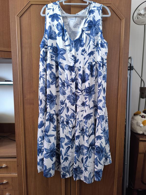 Продаю нову літню сукню з 100% віскози. Легка, приємна до тіла, добре пропускає повітря — ідеальна для спекотних днів. Заміряння: Півобхват грудей: 53 см Півобхват бедер: 79 см Довжина по спинці: 113 см Колір: білий з синім принтом Стан: нова, жодного разу не носили